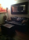 - Leather Living Room Set, includes couch, ottoman and two modern black glass end tables. Asking $350.