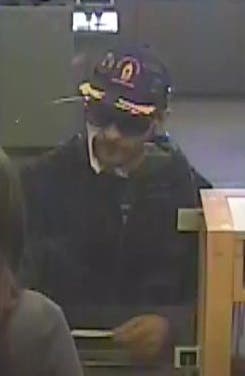 The robber was described as a white, about 5-foot-7 with a medium build, and between 25 and 30-years-old. He had a scruffy blond beard and was wearing dark basketball shorts, a dark-colored hooded jacket, large black sunglasses and a dark-colored baseball hat with yellow writing and yellow oak leaves on the brim.