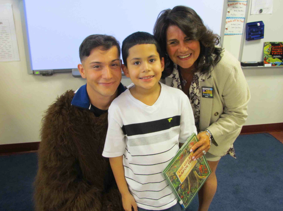 Photo provided by West Babylon School District: U.S. Marine Corporal David Cabrera is pictured with third-grade South Bay Elementary School student and brother Tristan Cabrera and third-grade teacher Carol Brett.