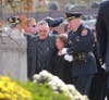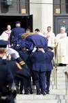 As officers stood at attention, some with tears in their eyes, a police band played the hymn "Amazing Grace" on bagpipes as palbearers carried a Nassau County flag-draped coffin inside of the church.