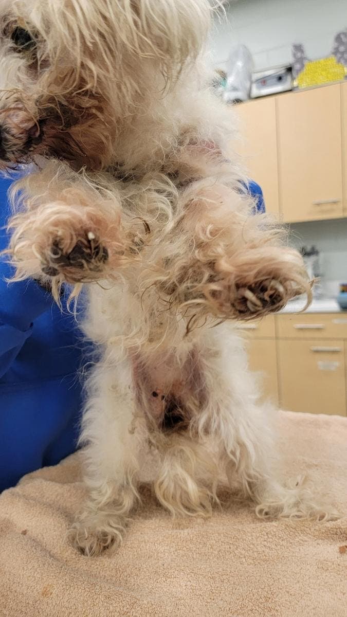 Minni, a female Maltese, was found extremely matted and covered with feces, urine, dirt and debris throughout her fur, said the SPCA.