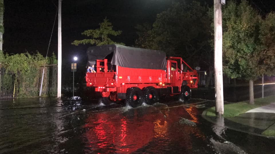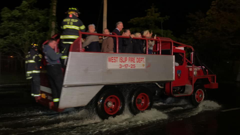 Firefighters used a repurposed 5-ton military vehicle — which had been delivered to the Bay Shore fire department the day before the flood — to help rescue the people, with help from the West Islip Fire Department.