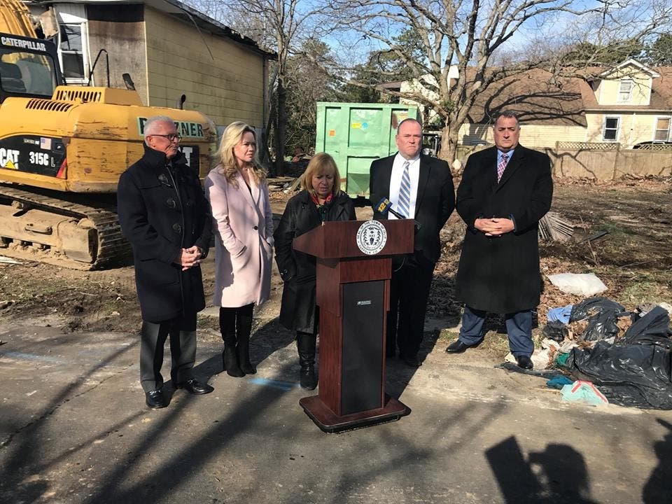Islip Town Supervisor Angie Carpenter and members of the Islip Town Board as well as other Town officials were on site at the home on 1628 E. 3rd Avenue during the demolition.