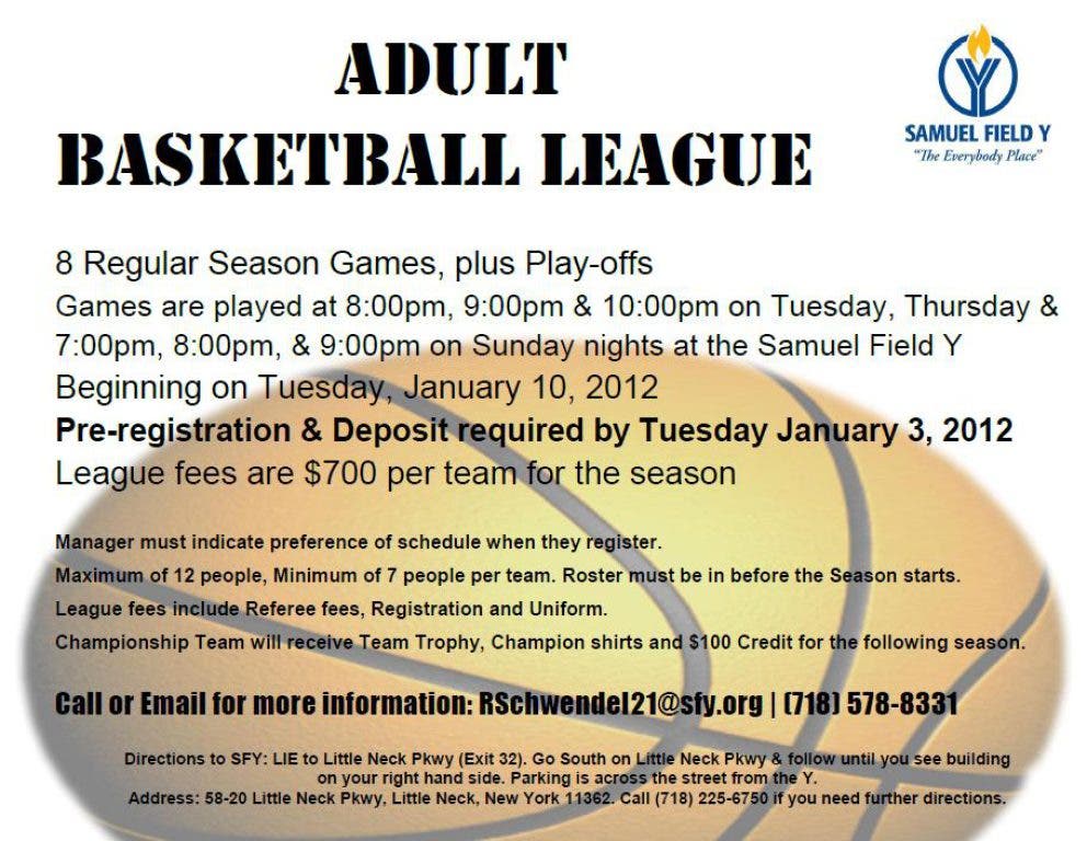 Visit our Website and Facebook Page for more information. www.samuelfieldyadultbasketballleague.leagueapps.com/