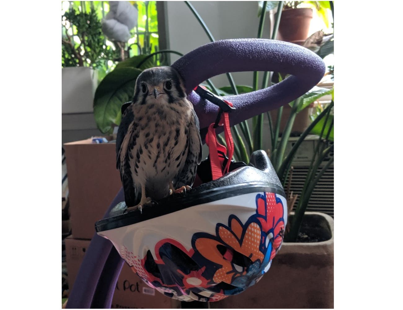 As the day went on, the falcon seemed to relax and even hopped around Chen's home a bit, taking a break to perch on some toys.
