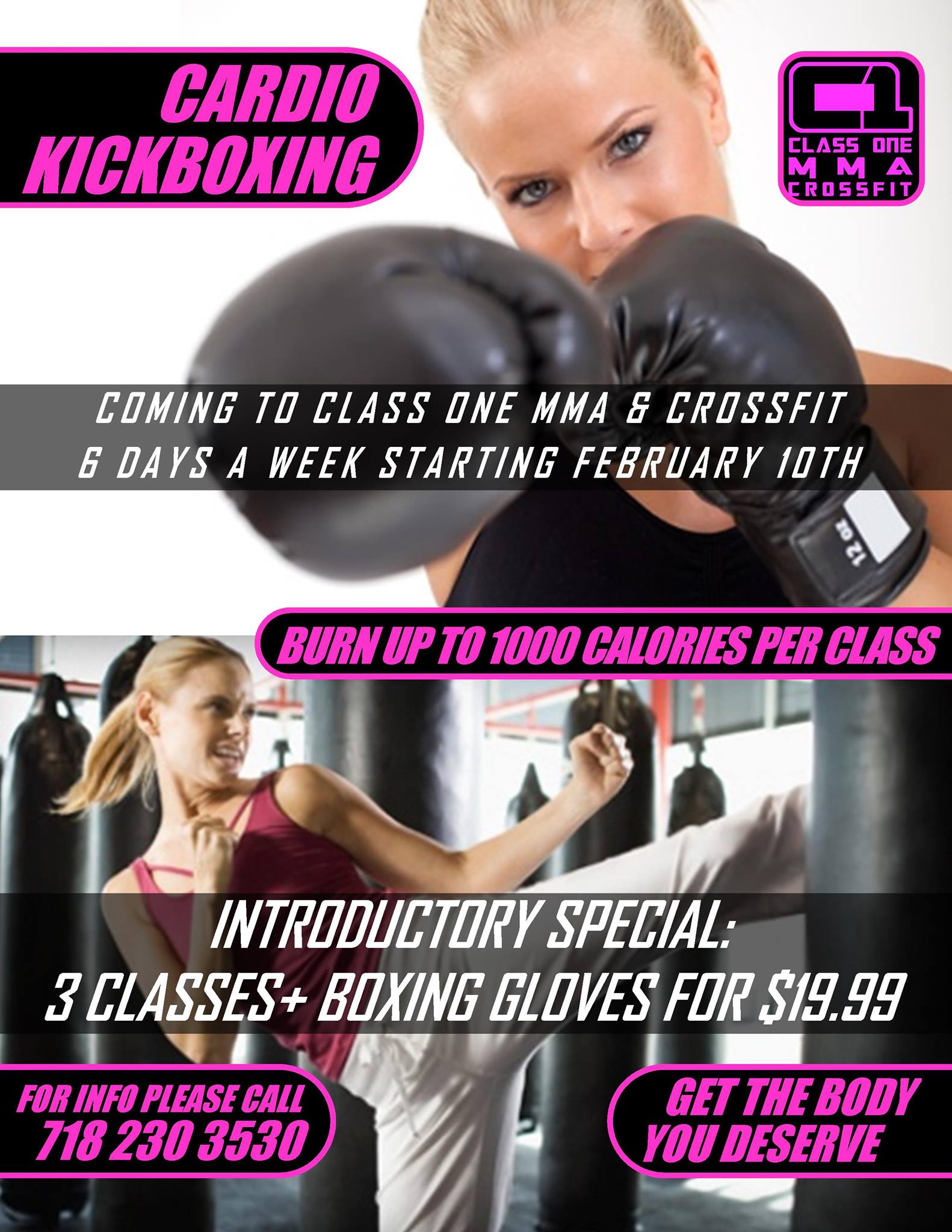 Keep that New Year's resolution you made and get the body you deserve! Burn up to 1,000 calories per class. Class One MMA & CrossFit will be starting a full cardio kickboxing program with classes 6 days per week starting February 10th. Try out our introductory offer: 3 Cardio-Kickboxing classes plus free boxing gloves ($40 value) for only $19.99. To purchase click on the following link:http://clients.mindbodyonline.com/ws.asp?studioid=26207&stype=41&prodid=10213