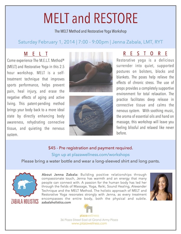 Come experience The M.E.L.T. Method® (MELT) and Restorative Yoga in this 2 hour workshop. MELT is a self-treatment technique that improves sports performance, helps prevent pain, heal injury, and erase the negative effects of aging and active living. This patent-pending method brings your body back to a more ideal state by directly enhancing body awareness, rehydrating connective tissue, and quieting the nervous system.