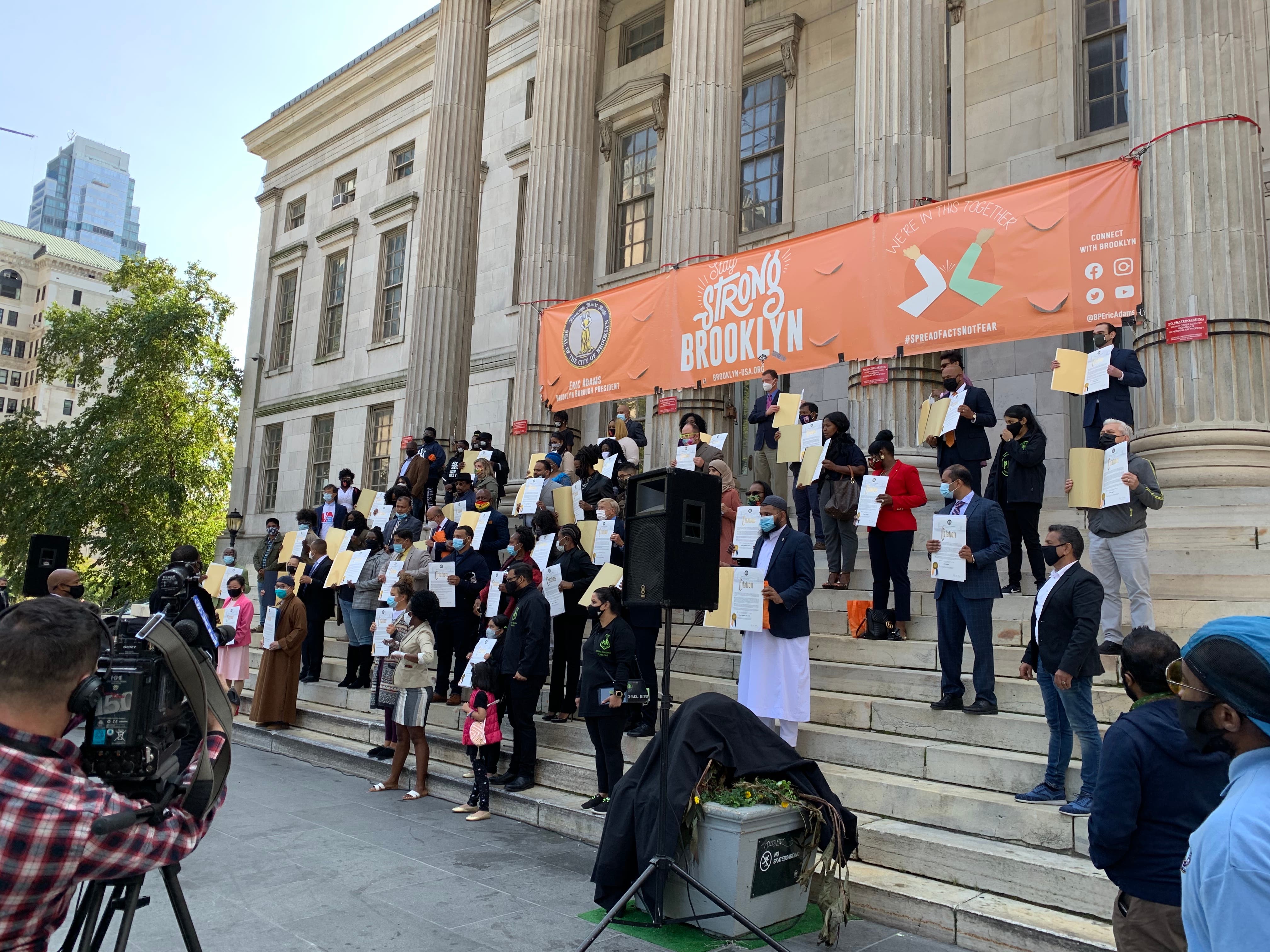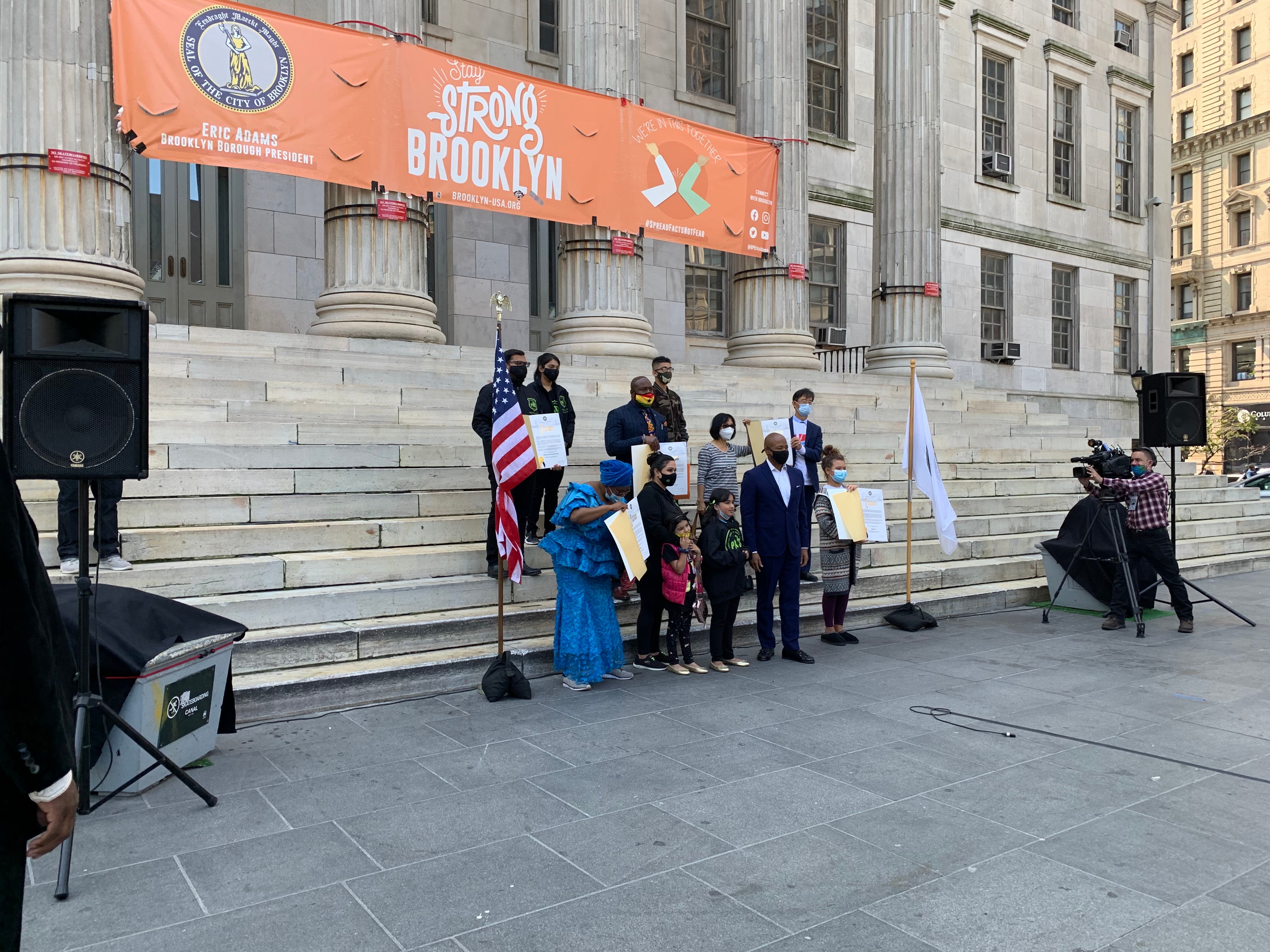 The ceremony, put on by Borough President Eric Adams, gave certificates to 81 "COVID Heroes" at Brooklyn Borough Hall. It was an especially-large edition of the borough president's "Heroes of the Month" series, which recognizes every day Brooklynites for acts of good service.