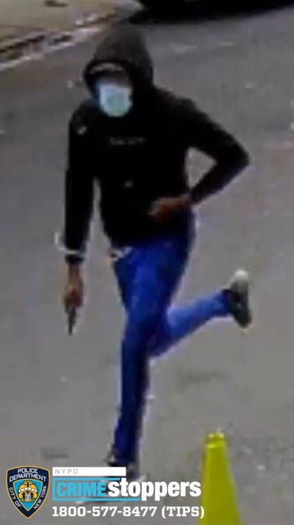 The shooter wore a dark colored hooded sweater with a blue graphic on its back, blue sweatpants and black sneakers, police said. They released several photos of him and the getaway car, along with the surveillance video: