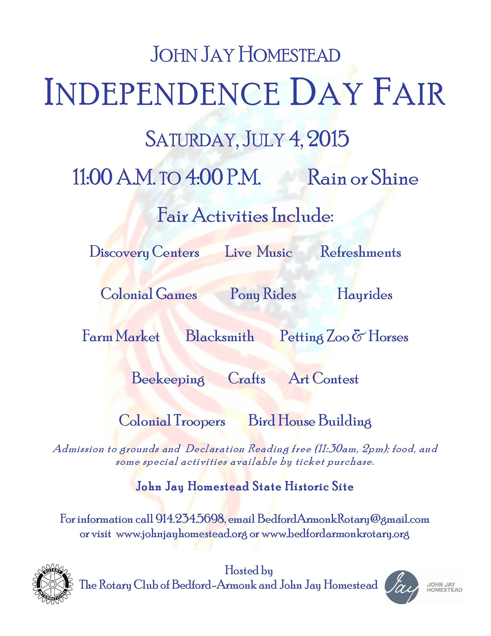 Opportunities for 4th of July 2015 family fun begin at John Jay Homestead at 11:00 a.m. with the Independence Day Fair featuring barbeque hamburgers and hot dogs and refreshments for purchase, a reading of the Declaration of Independence, live music, log sawing, Revolutionary horseman George Washington and Col. Humphries, house tours, bird house building, petting zoo and horses, pony rides, blacksmith, hayrides, crafts, beekeeping, art display, discovery center, Colonial games and more. The fair runs from 11:00 a.m. until 4:00 p.m. It is presented by the John Jay Homestead and the Bedford-Armonk Rotary Club. A farmers market begins at 9:00 a.m. the day of the fair. Address: John Jay Homestead State Historic Site, 400 Jay Street, Katonah NY 10536. Info: http://www.johnjayhomestead.org 914-232-8119 friends@johnjayhomestead.org