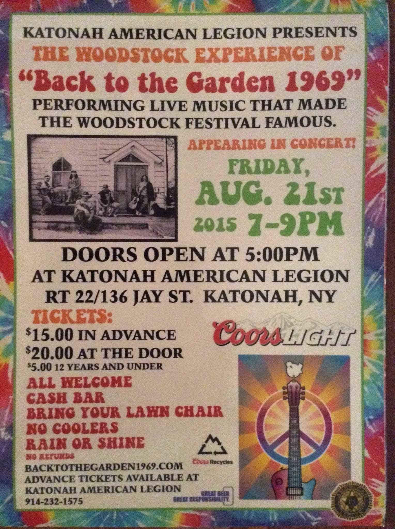 The Katonah American Legion is hosting a concert by Back to the Garden 1969, a Woodstock-themed show featuring the sounds of the Sixties, on Friday, Aug. 21.
