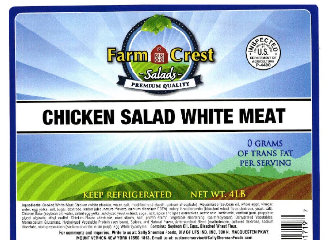 - 4-lb. Plastic container of Sally Sherman “Farmcrest Chicken Salad,” with a packaging date of Feb. 2, 4, 9, 11, and 18, 2016 and a case code of N-184, N-114, N-026, N-044, N-096.