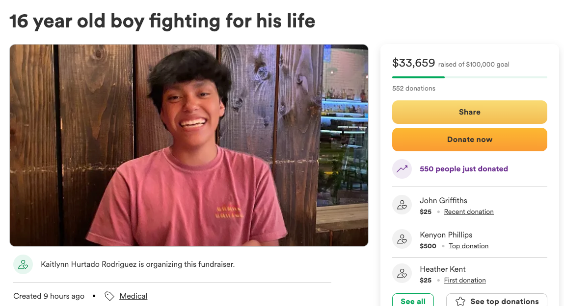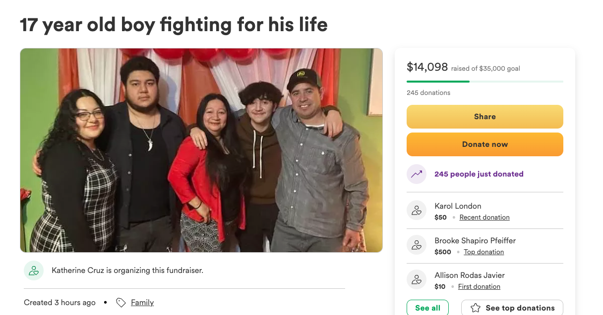 "He is always the go to friend that the rest of the boys would come to and spend time at our house," Martinez's older sister writes. "They all have been friends since kids. He is only a Junior in High School. He is also a hard worker at Skyzone/Rockin Jump. He always has a big smile on his face and cracking up jokes and making anyone laugh when he can ... My family is having a hard time just trying to process everything that is going on with him and his other friends who are also in critical care as him."