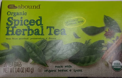 The product is labeled “Gold Emblem Abound Organic Spiced Herbal Tea 1.41 oz” and was packed in 1.4-ounce cartons.