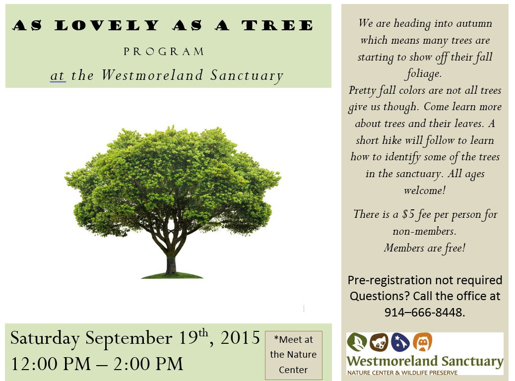 We are heading into autumn which means many trees are starting to show off their fall foliage. Pretty fall colors are not all trees give us though, come learn more about trees and their leaves. A short hike will follow to learn how to identify some of the trees in the sanctuary.