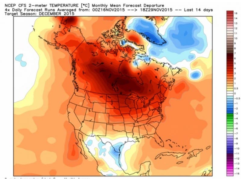 “The highly anomalous warmth in December that is anticipated to develop across North America is attributed to weather patterns driven by the strongest El Nino observed in our data archives,” Ventrice said.