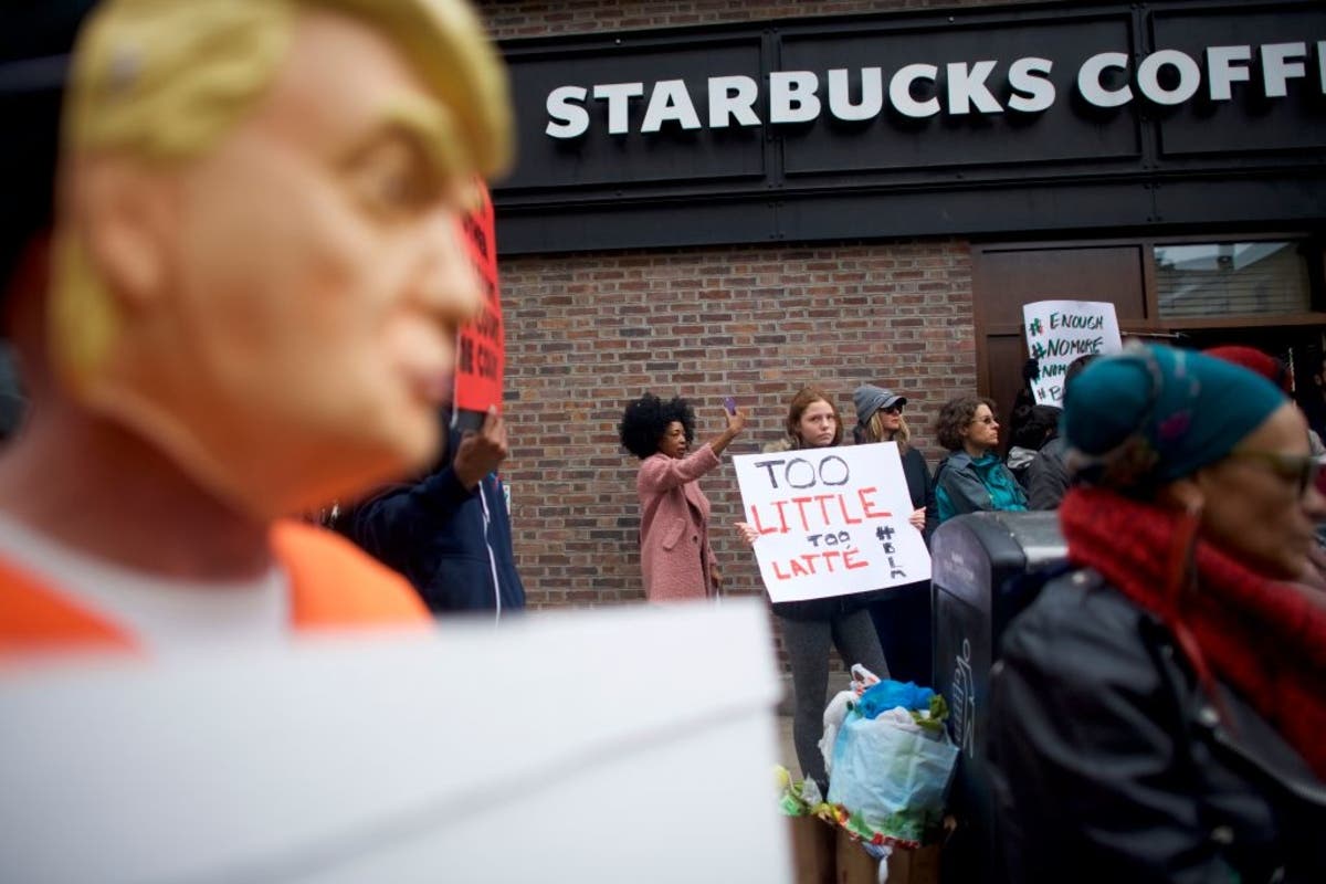Caption: Protestor Soren Mcclay, 14, (C) demonstrates outside a Starbucks on April 15, 2018 in Philadelphia, Penn. Police arrested two black men who were waiting inside a Center City Starbucks which prompted an apology from the company's CEO. (Photo by Mark Makela/Getty Images)