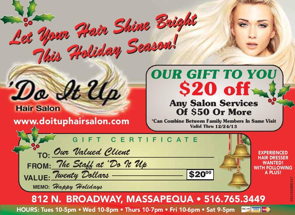 Happy Holidays from Do It Up Hair Salon! Enjoy $20 off your next hair service of $50 or more!