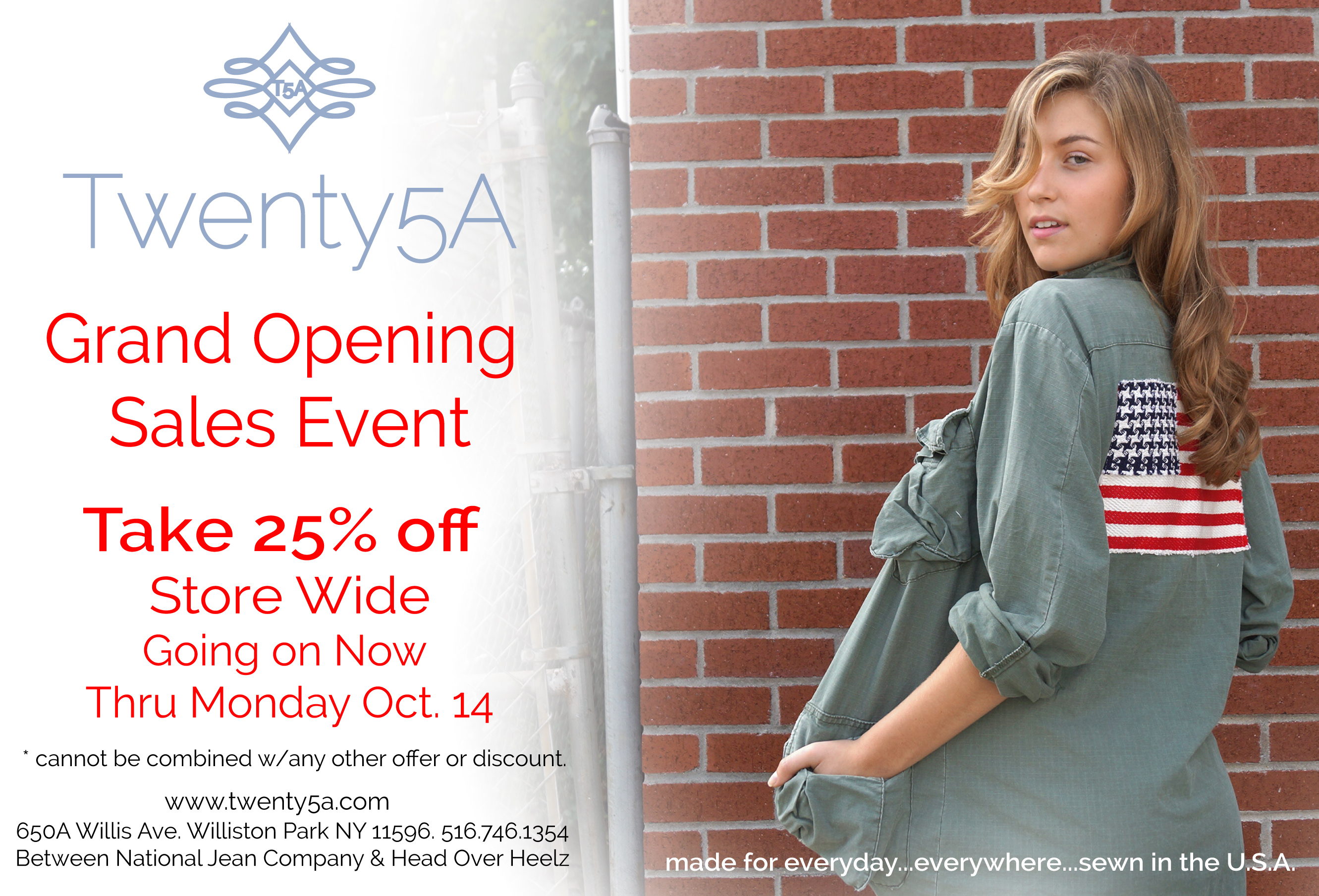 Twenty5A , American Made, fashion active casual lifestyle clothing brand. Grand Opening sale going on now through Monday 10/14. Take 25% store wide. See in store for details.