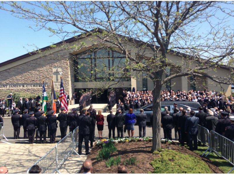 Moore’s extended family in blue flocked to the area and lined Hicksville Road by the thousands to guard the route into Seaford’s St. James Roman Catholic Church.