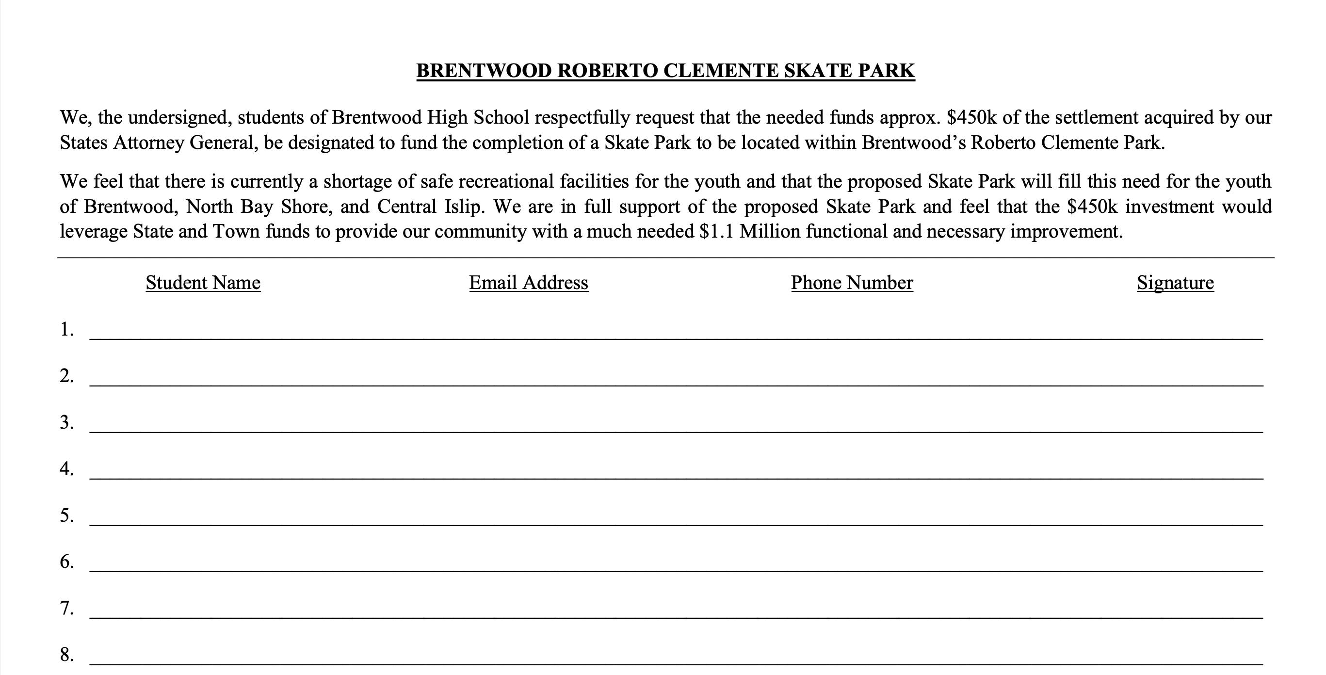 Alberto Melgar, a graduating senior at Brentwood High School, created a petition, crying out for the Attorney General's office to obtain the settlement money in order to fund the skate park.