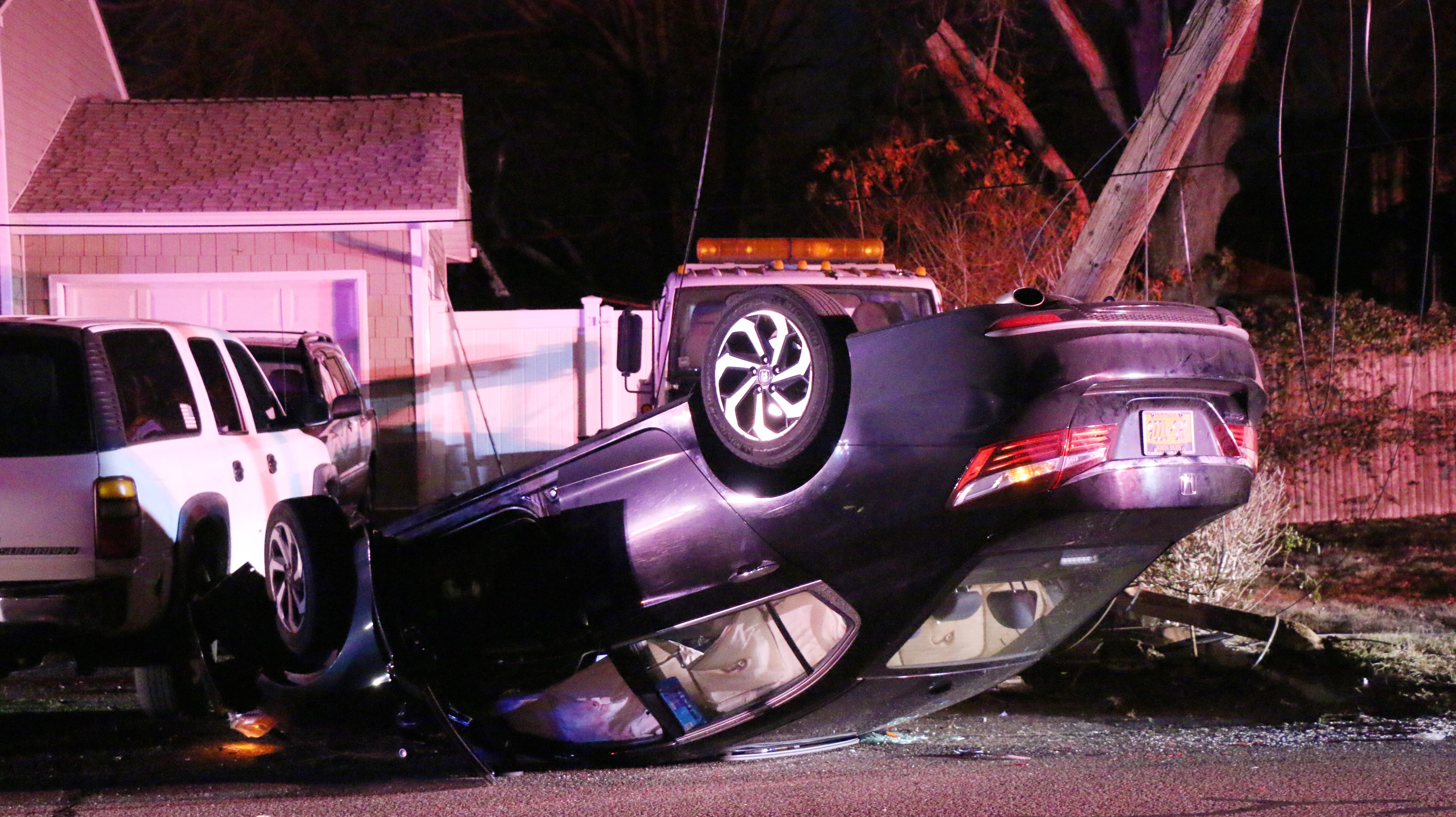 The 21-year-old crashed into a utility pole, causing the car to overturn Sunday night, police say.