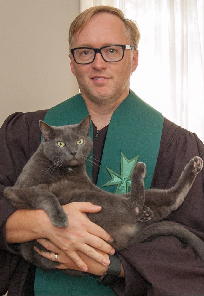 Photo: Rev. Tim Dalton with his family’s pet cat Smokey.
