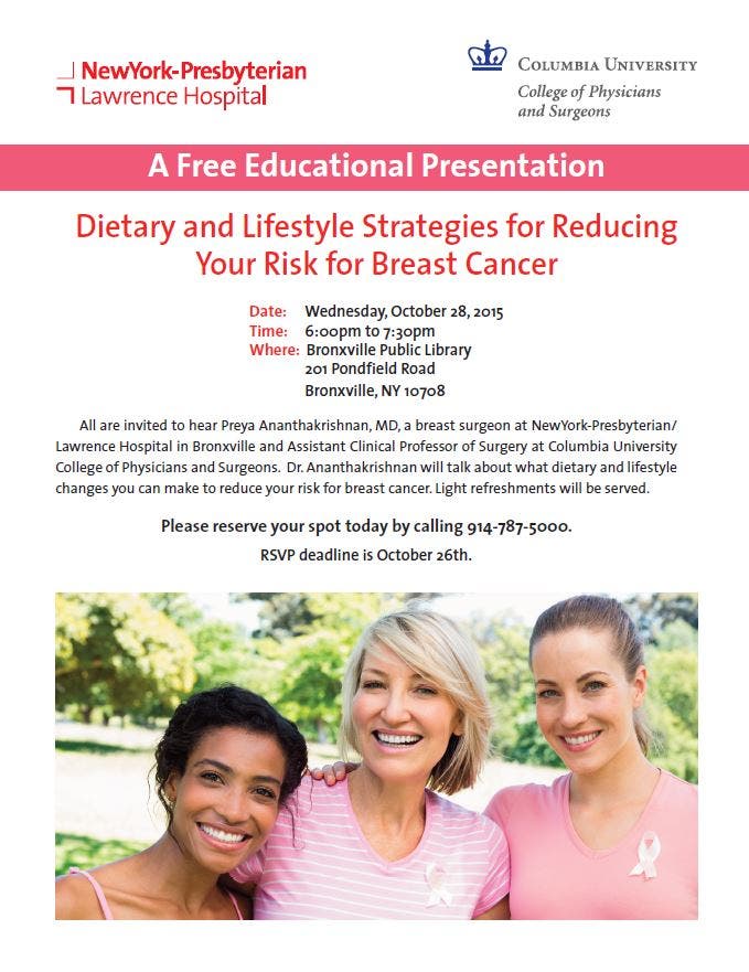 All are invited to hear Preya Ananthakrishnan, MD, a breast surgeon at NewYork-Presbyterian/Lawrence and Assistant Clinical Professor of Surgery at Columbia University College of Physicians and Surgeons on Wednesday, Oct. 28 from 6:00 to 7:30 PM at the Bronxville Public Library. Dr. Ananthakrishnan will talk about what dietary and lifestyle changes you can make to reduce your risk for breast cancer. Light refreshments will be served. Please call 914-787-5000 to reserve your spot.