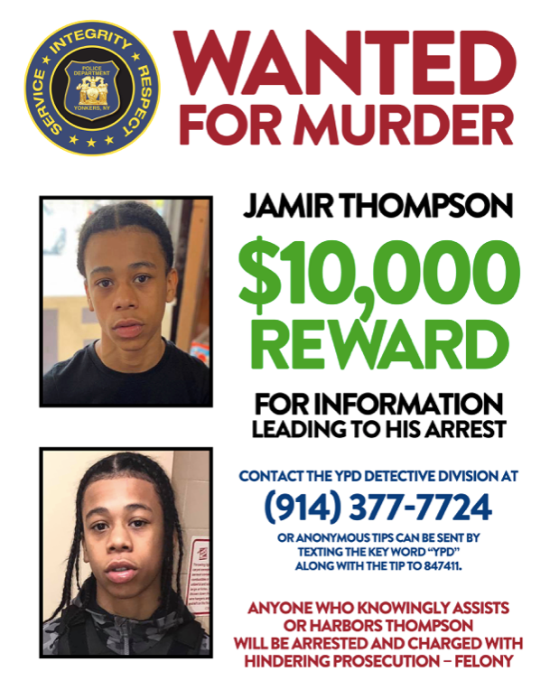 YONKERS, NY — The Yonkers Police Department has increased the reward for information leading to the arrest of murder suspect Jamir Thompson, 15, of Yonkers. The reward is now $10,000 — up from $5,000.