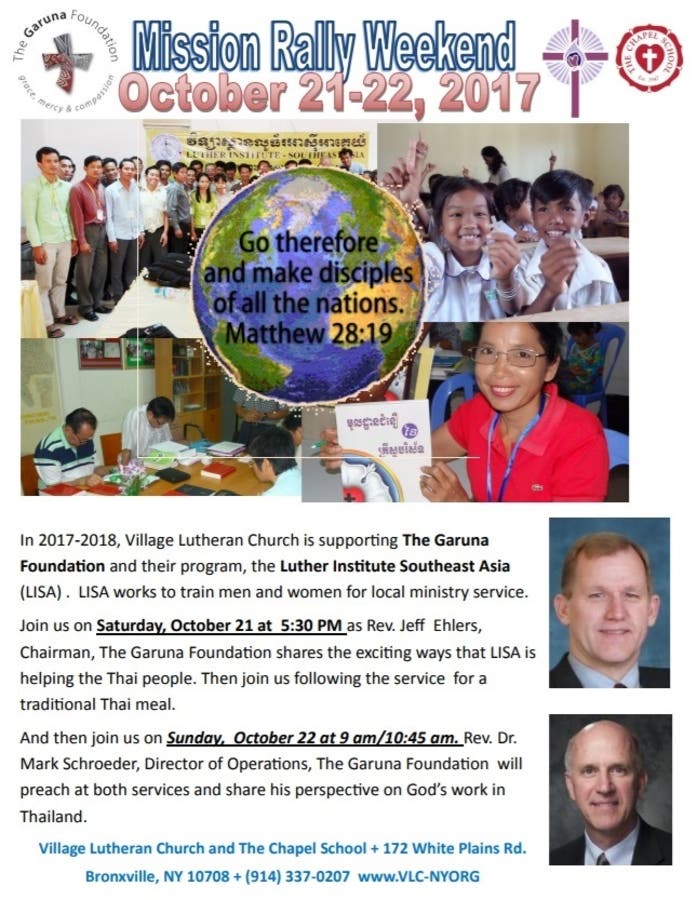 On Sunday, October 22 at 9 am/10:45 am. Rev. Dr. Mark Schroeder, Director of Operations, The Garuna Foundation will preach at both services and share his perspective on God’s work in Thailand.