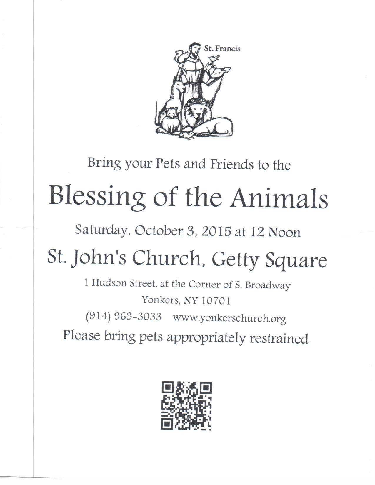 Welcome to The Blessing Of The Animals Service on Saturday, October 3rd, 2015 at 12 Noon to 2:30PM. Attend & invite friends, bring your pets appropriately restrained. Certificate Awards & treats given Location: St. John’s Episcopal Church, Getty Square, 1 Hudson St, bet. So. Broadway and Riverdale Avenue, Yonkers, NY 10701 914-963-3033