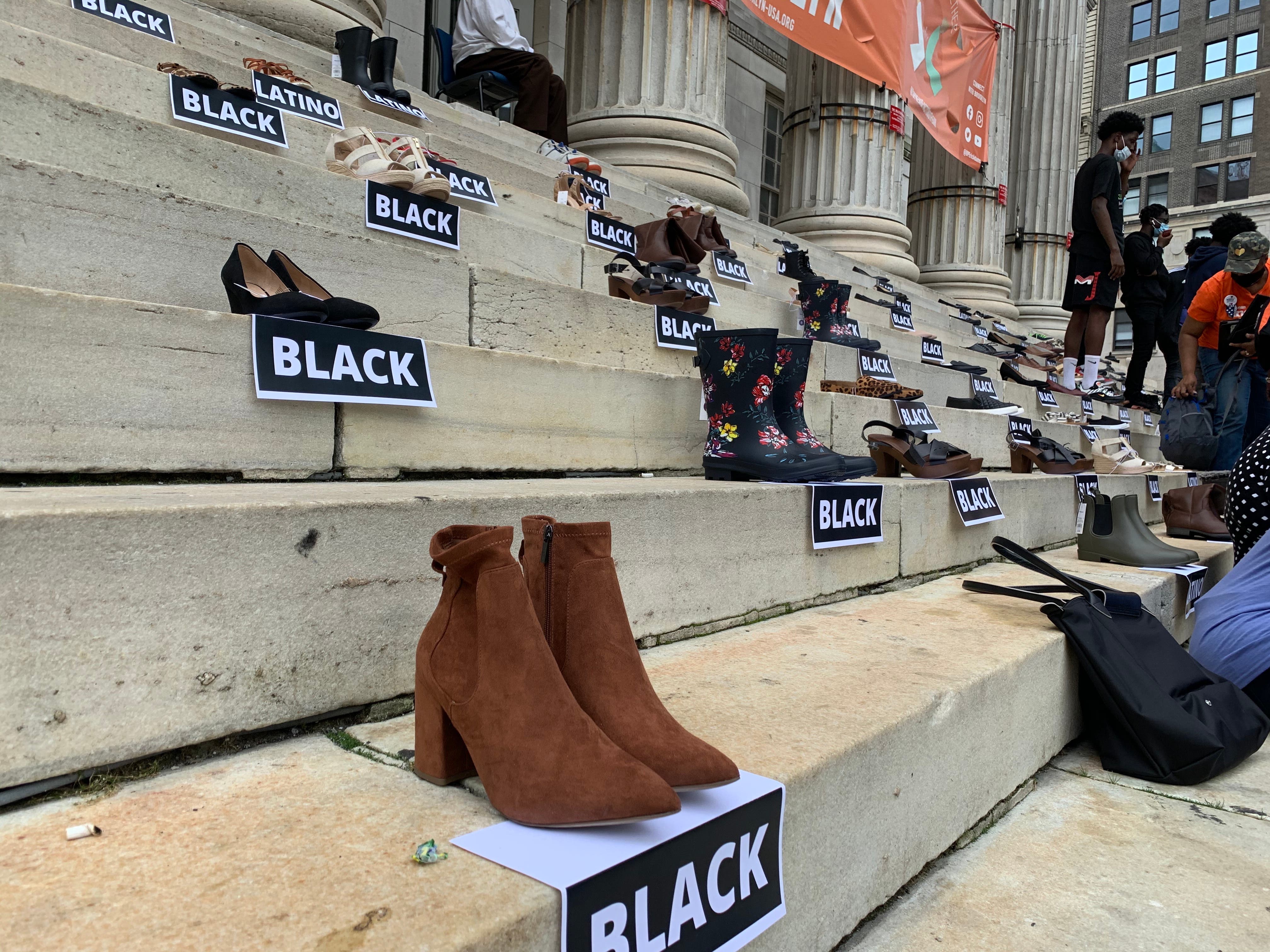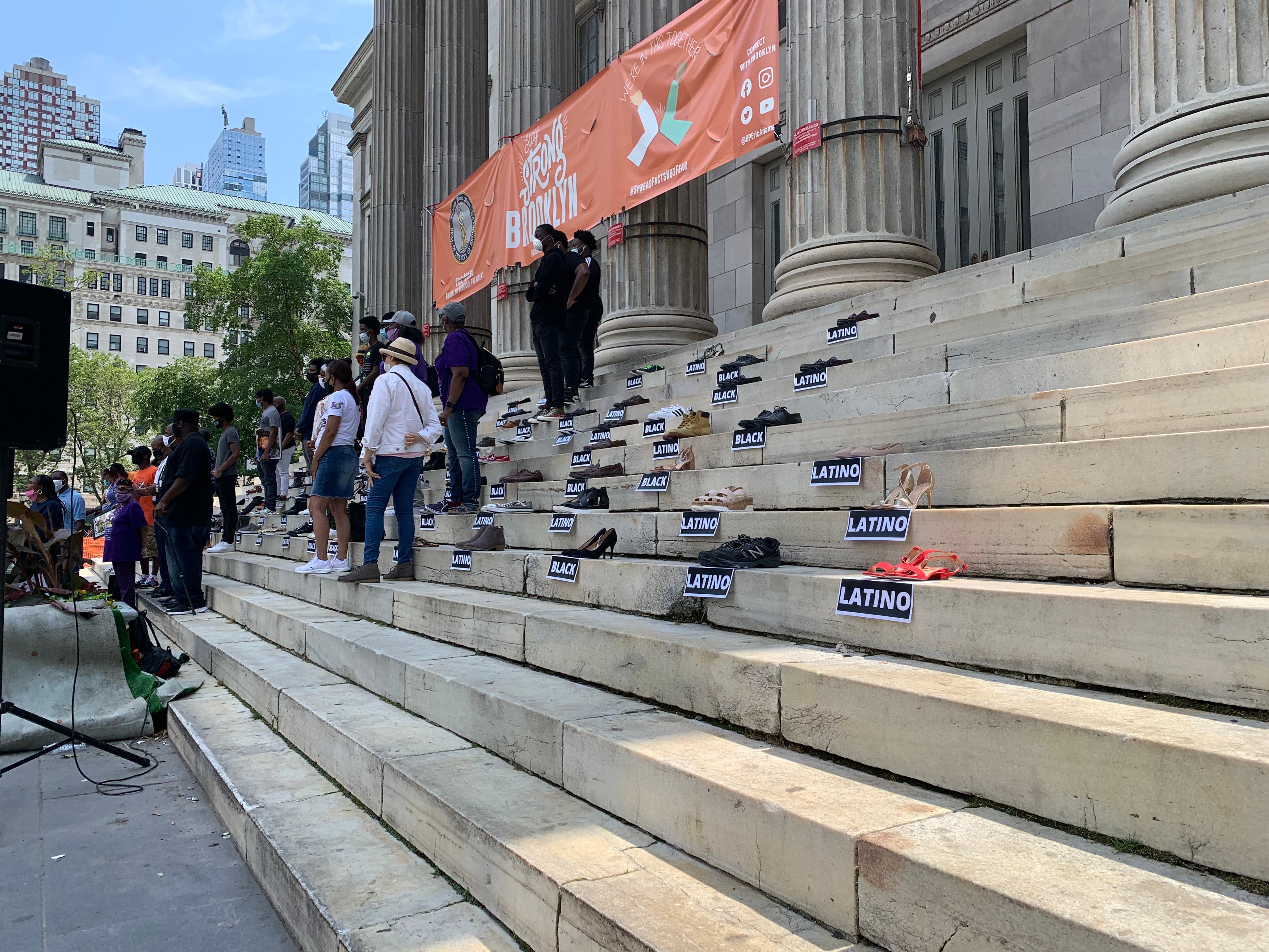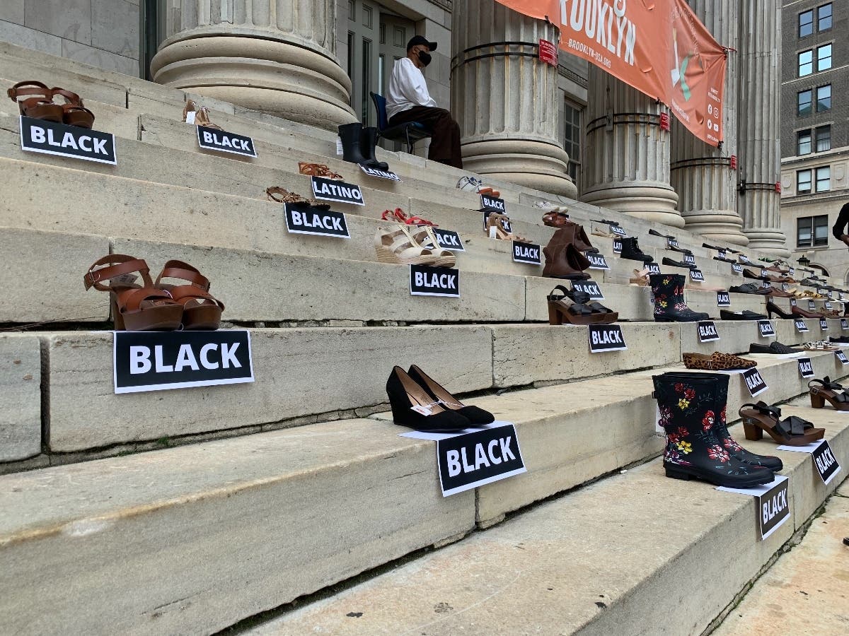 DOWNTOWN, BROOKLYN — Another layer of the Black Lives Matter movement was on full display Wednesday at Brooklyn Borough Hall, where 101 pairs of shoes representing people shot in New York City in the last week lined the steps.