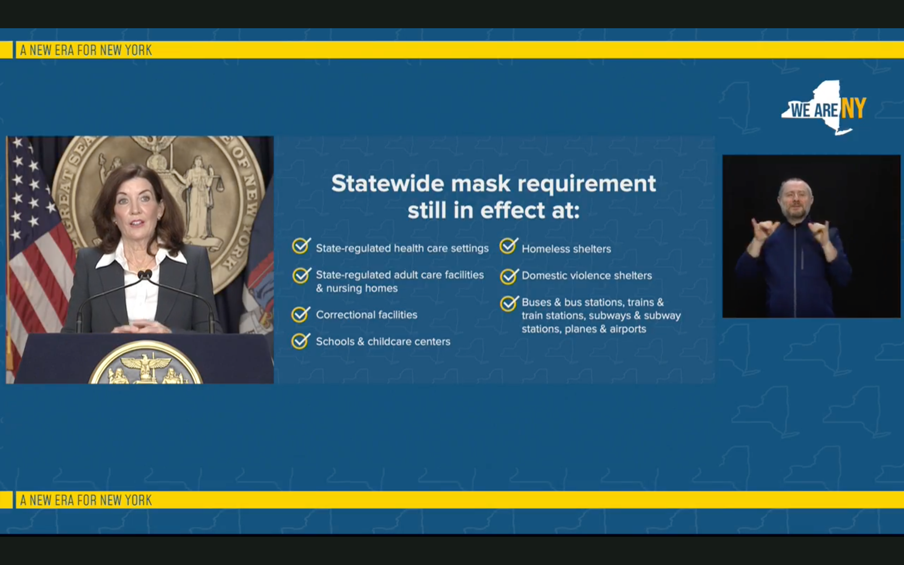 "New Yorkers, this is what we've been waiting for," Hochul said. "It is the right decision to lift this mandate for indoor businesses and let counties, cities and businesses to make their own decisions on what they want to do."