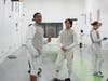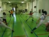 In one room, a student jumped rope. Next to him, another student did very short wind sprints designed to exercise the fast-twitch leg muscles essential to fencing. In the next room, two sets of fencers faced off in practice rounds, refereed by another student.