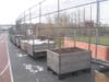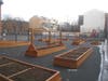 The schoolyard features a long elegant line of square raised beds, three Earth Machine compost bins, two large worm bins and a rainwater harvesting system.