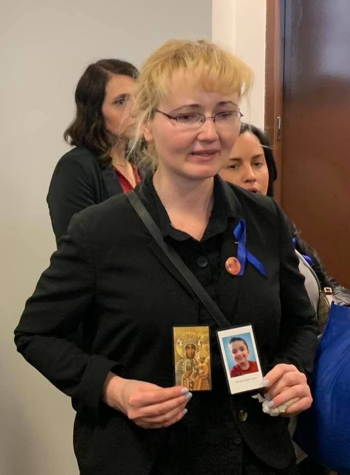 RIVERHEAD, NY — Clutching the prayer card from her son's funeral and wearing a button with his photo and a blue ribbon for child abuse, Justyna Zubko-Valva sobbed audibly in court in Riverhead Thursday as Assistant District Attorney Kerriann Kelly painted a grim depiction of the day Thomas Valva, 8, died — after, according to police, he was left overnight in a frigid garage in his father's Center Moriches home.
