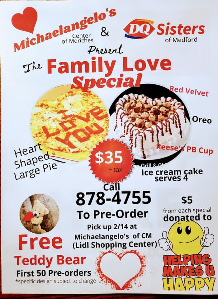 Keith and his mother Cassy Caputo teamed up with Michelangelo of Center Moriches, located at 794 Main Street in Center Moriches, and Dairy Queen in Medford for "The Family Love Special" fundraiser: For $35 plus tax, pizza lovers can order a heart-shaped pie and a red velvet ice cream cake. The first 50 people to order will receive a free teddy bear. And $5 from each order goes to Helping Makes U Happy.