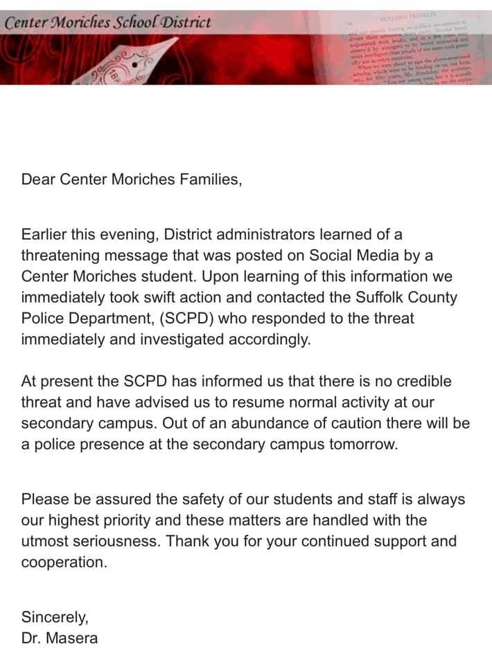 On Thursday night, Masera posted a message for Center Moriches families, explaining that a threat had been posted by a student from Center Moriches. The district contacted Suffolk County Police, who responded to the threat and investigated, he said.