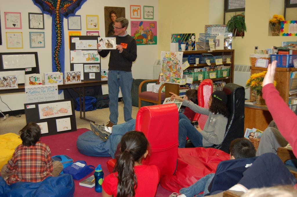 Children’s book author/illustrator and Chappaqua resident Matthew Van Fleet visited Robert E. Bell Middle School recently to take students inside his books. Literally.