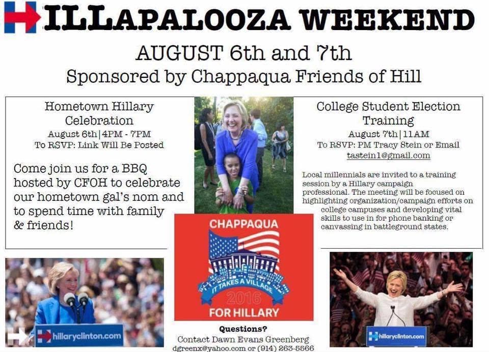 Hillary Clinton's supporters in the Clintons' hometown of Chappaqua are hosting a couple of events this coming weekend.