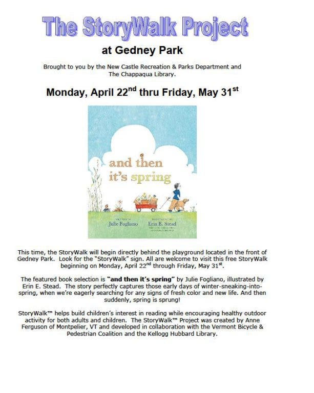 This time, the StoryWalk will begin directly behind the playground located in the front of Gedney Park. Look for the “StoryWalk” sign. All are welcome to visit this free StoryWalk beginning on Monday, April 22nd through Friday, May 31st.