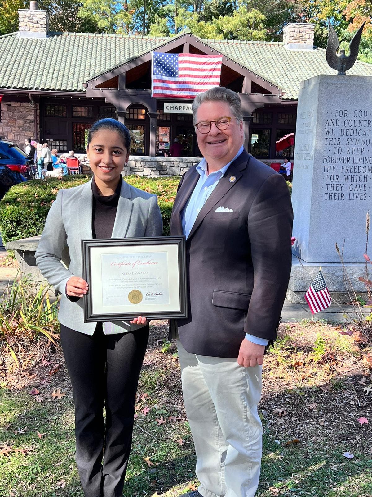 Netra Easwaran has been awarded the "Certificate of Excellence" by New York State Senator Peter Harckham for her leadership of Project Certify. Her campaign helps community, non-profit, and service organizations to be recognized as Certifying Organizations for the President's Volunteer Service Award (PVSA).