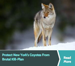 The Westchester Town of New Castle, New York which consists primarily of the hamlets of Chappaqua and Millwood, is considering the formal adoption of a Draconian coyote killing plan that calls for trapping/killing coyotes considered “habituated.” “This misguided, hateful idea is in response to a handful of coyote attacks on small dogs and cats over the past couple of years—all of which could be easily prevented by educating pet owners and residents,” says Edita Birnkrant, Campaigns Director for Friends of Animals.