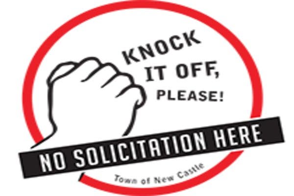 There are two ways in which peddlers and solicitors will be provided notice of the “Do Not Knock” list. First, every registrant under the New Castle Town Code will be issued a copy of the then-current “Do Not Knock” list simultaneously with the registration certificate issued by the Chief of Police. In addition, residents can place a 6” x 6” decal near their front door that states “Knock It Off, Please - No Solicitation Here”. Decals will be available, during regular business hours, at Town Hall. Residents must be signed up on the “Do Not Knock” list prior to receiving a decal.
