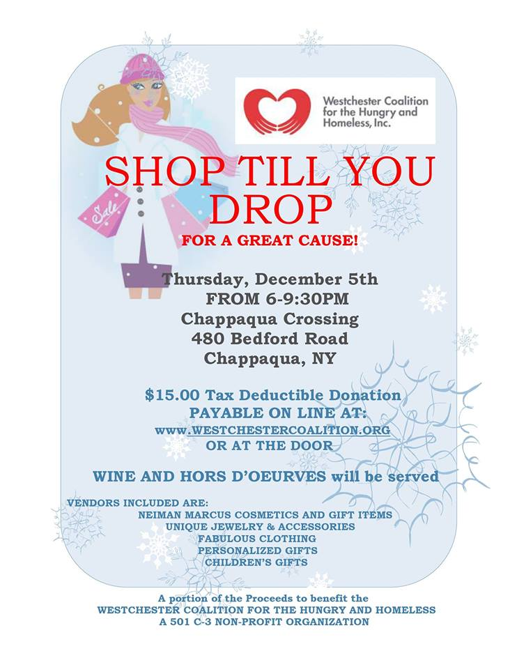 White Plains, NY….. Shoppers looking to share special gifts with loved ones, friends, and co-workers can now simultaneously shop and help the hungry and homeless in Westchester County, thanks to an exciting shopping event “Shop ‘till You Drop” being spearheaded by the Westchester Coalition for the Hungry and Homeless (WCHH), a leading organization advocating for Westchester’s neediest residents. The special shopping event will be held December 5, 2013 from 6:00 p.m. to 9:30 p.m. at Chappaqua Crossing, 480 Bedford Road, Chappaqua, New York. A portion of the proceeds will fund operations and programs provided by WCHH, many of which were gutted by government funding cuts. A dozen vendors from leading shops and boutiques like Nieman Marcus will be selling some of the season’s hottest gifts.