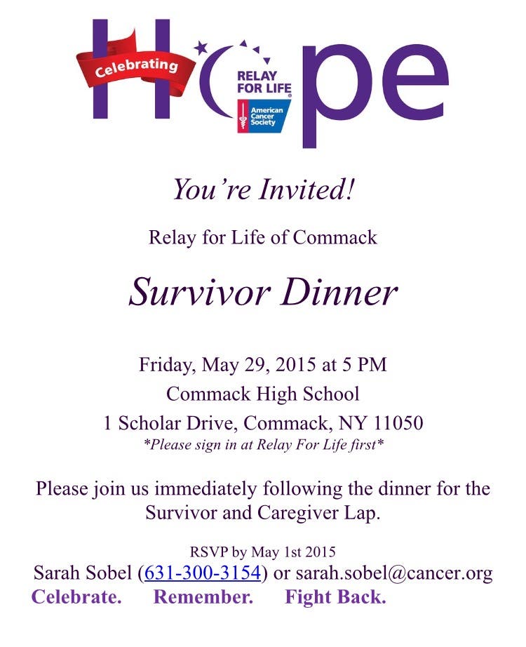 Commack Relay for Life will be hosting a Survivor Dinner on Friday, May 29th at 5:00 pm