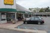A dark green sign runs along the face of the L-shaped shopping center. Large white letters spell the names of the businesses there, except for a few gaps over shops that sit empty.