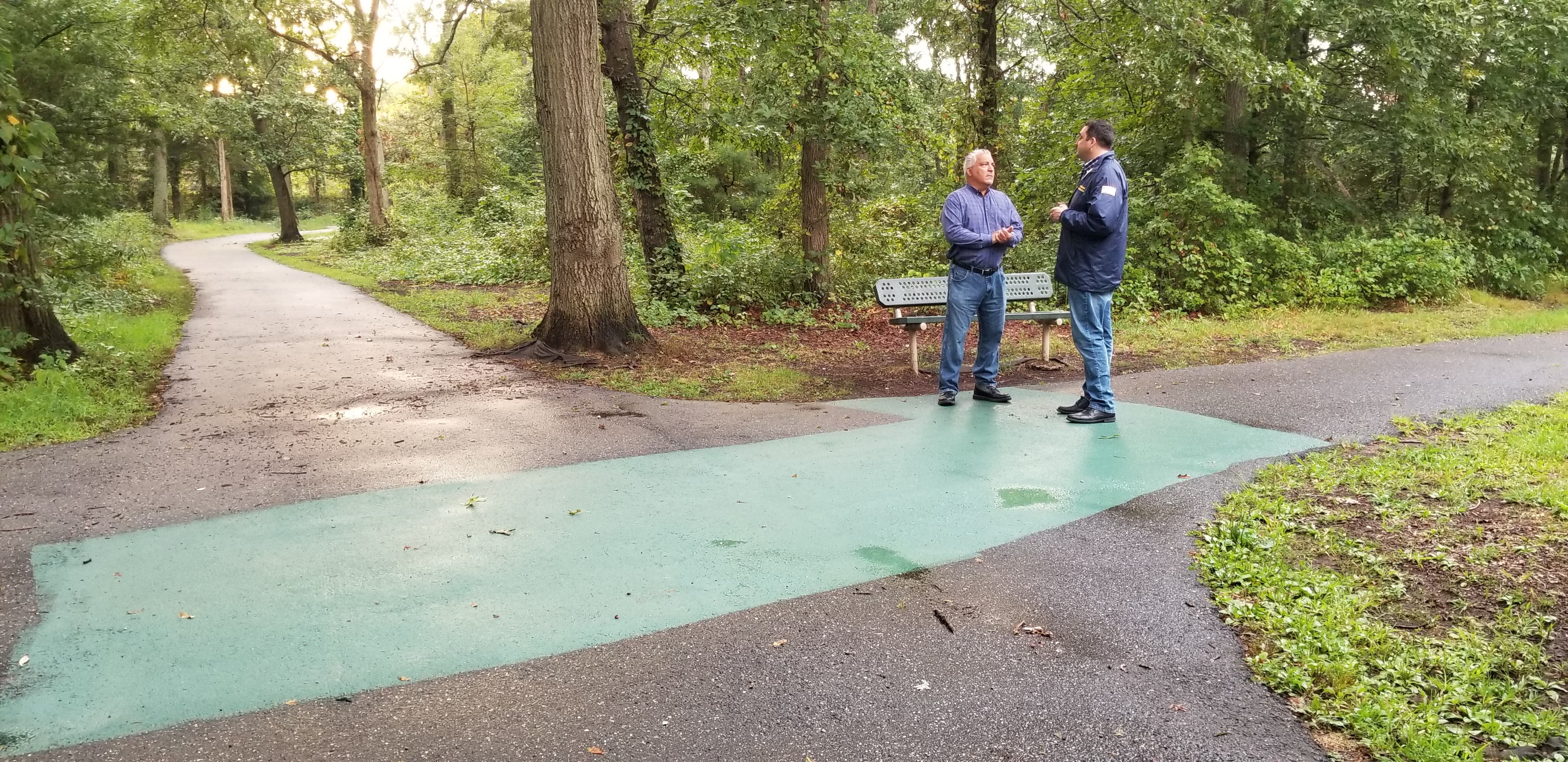 Lupinacci visited the park on Monday to be briefed by Director of General Services, Andre Sorrentino, whose staff temporarily painted over the graffiti with green paint on a paved path over the Labor Day holiday weekend until they would be able to permanently seal-coat the area.