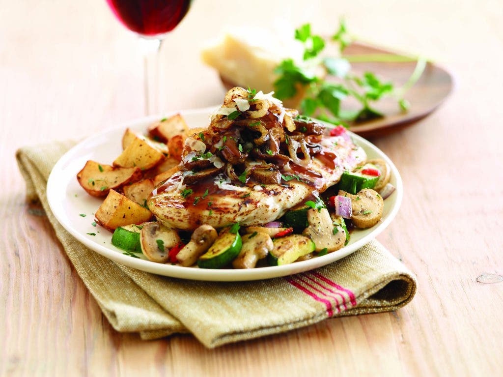 Applebee’s new Napa Chicken and Portobellos tops a grilled chicken breast with savory Portobello mushrooms and onions smothered in a rich red wine sauce and Parmesan cheese. It’s served over sautéed zucchini, mushrooms, roasted red peppers, red onions and crispy red potatoes. The caloric total for this meal is only 450—and the cost is under $10.