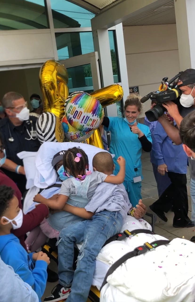 Jerome Smith, 44, of Copiague, is discharged from St. Joseph Hospital in Bethpage on Tuesday after a 74-day stay where he battled the coronavirus. He is reunited with his wife and six children. (Credit: St. Joseph Hospital)